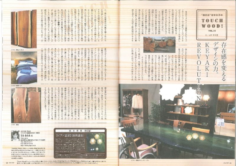 ジャパトラ10月号に「TOUCH WOOD!」の16号が掲載されました。今回は「ケヤキ」の話です。 広葉樹の代表格ともいえるケヤキ。しかし今では…