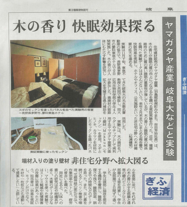 2024.12.04 メディア 12/4の岐阜新聞に掲載されました 12月4日の岐阜新聞4面に、弊社の商品「木の塗壁Mokkun」の木の香りが睡眠の質の向上につながるかを調べる実証実験についての記事が掲載されました。 …