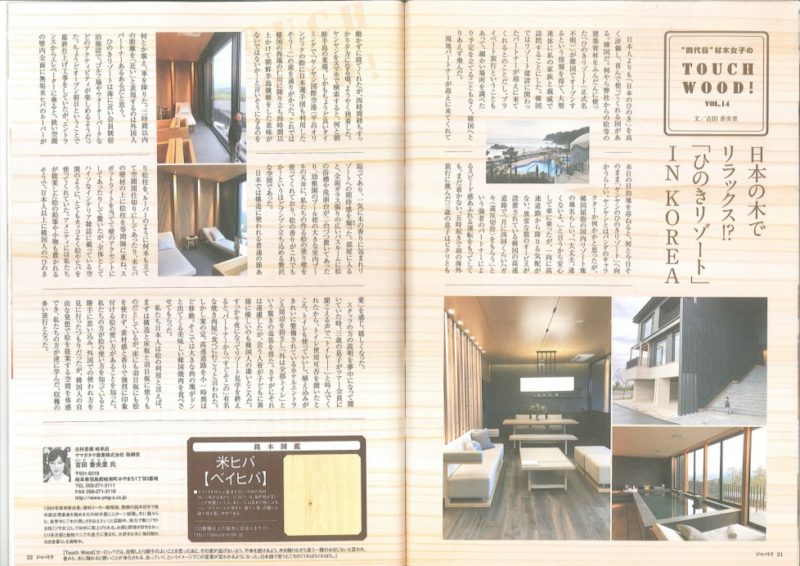 ジャパトラの8月号に「TOUCH WOOD!」の14号が掲載されました。 今回はヒノキが大好きな国、韓国へ行き弊社も納めたヒノキがあふれる「ヒノ…
