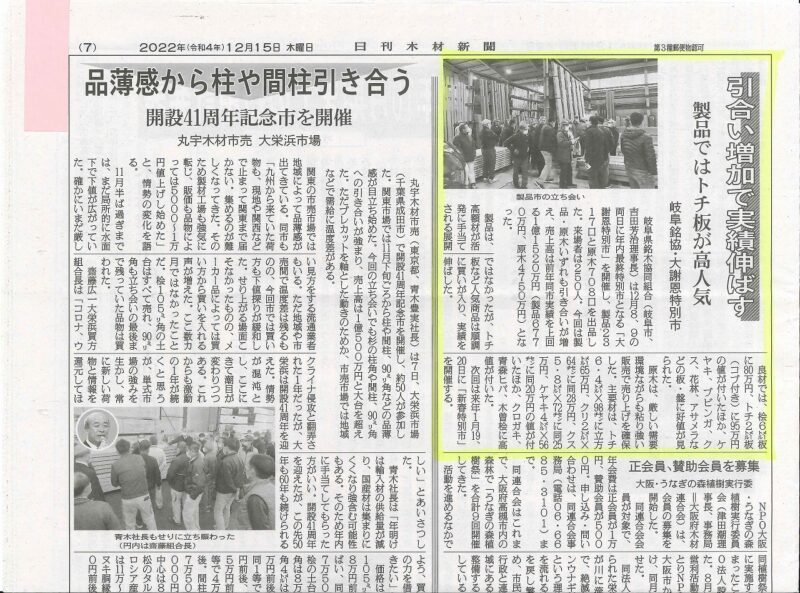 12月15日付の日刊木材新聞に、弊社社長が理事長を務める岐阜県銘木協同組合が開催した「大謝恩特別市」についての記事が掲載されました。 …