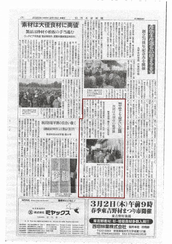 2月16日(木)付の日刊木材新聞に、弊社社長が理事長を務める岐阜県銘木協同組合が開催した「梅まつり特別市」についての記事が掲載されました。 …