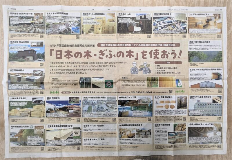 2023年1月27日の岐阜新聞広告特集「『日本の木・ぎふの木』を使おう!」にて、弊社の取組みが紹介されました。 SDGs関連商品の「木の…