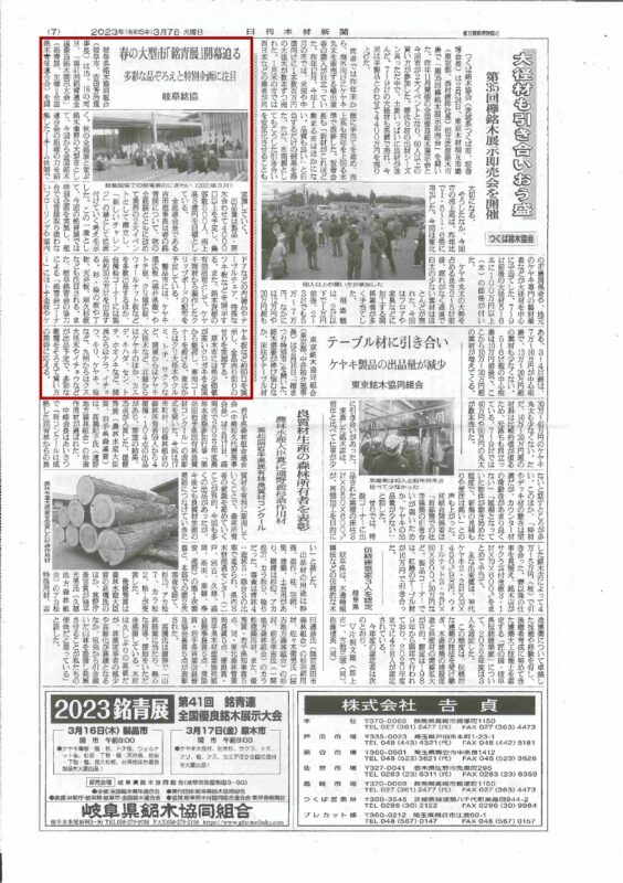 3月7日付の日刊木材新聞に、弊社社長が理事長を務める岐阜県銘木協同組合が開催する「第41回銘青連全国優良銘木展示大会」についての記事が掲載されました。…