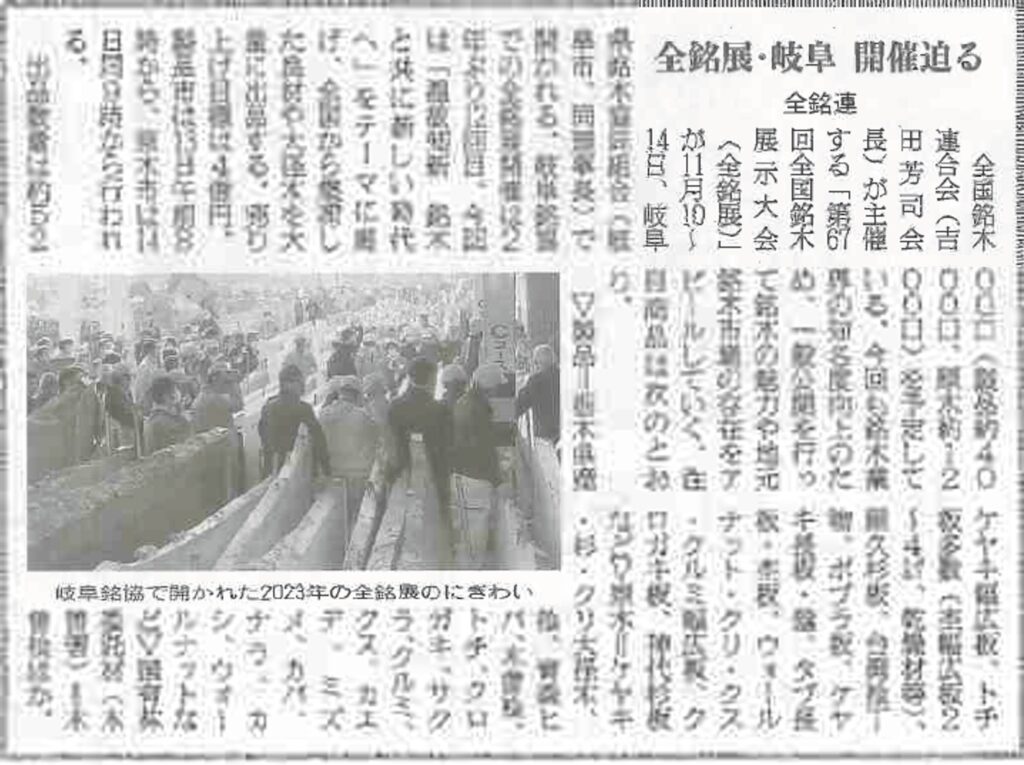 10月29日の日刊木材新聞にて、弊社社長が会長を務める全国銘木連合会主催の「第67階全国銘木展示大会」を、同じく弊社社長が理事長を務める岐阜県銘木協同組合にて開催する旨の記事が掲載されました。