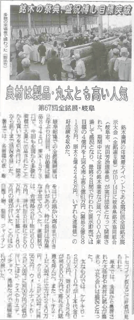 11月20日の日刊木材新聞にて、弊社社長が会長を務める全国銘木連合会および、同じく理事長を務める岐阜県銘木協同組合が開催した「第67回全国銘木展示大会」についての記事が掲載されました。