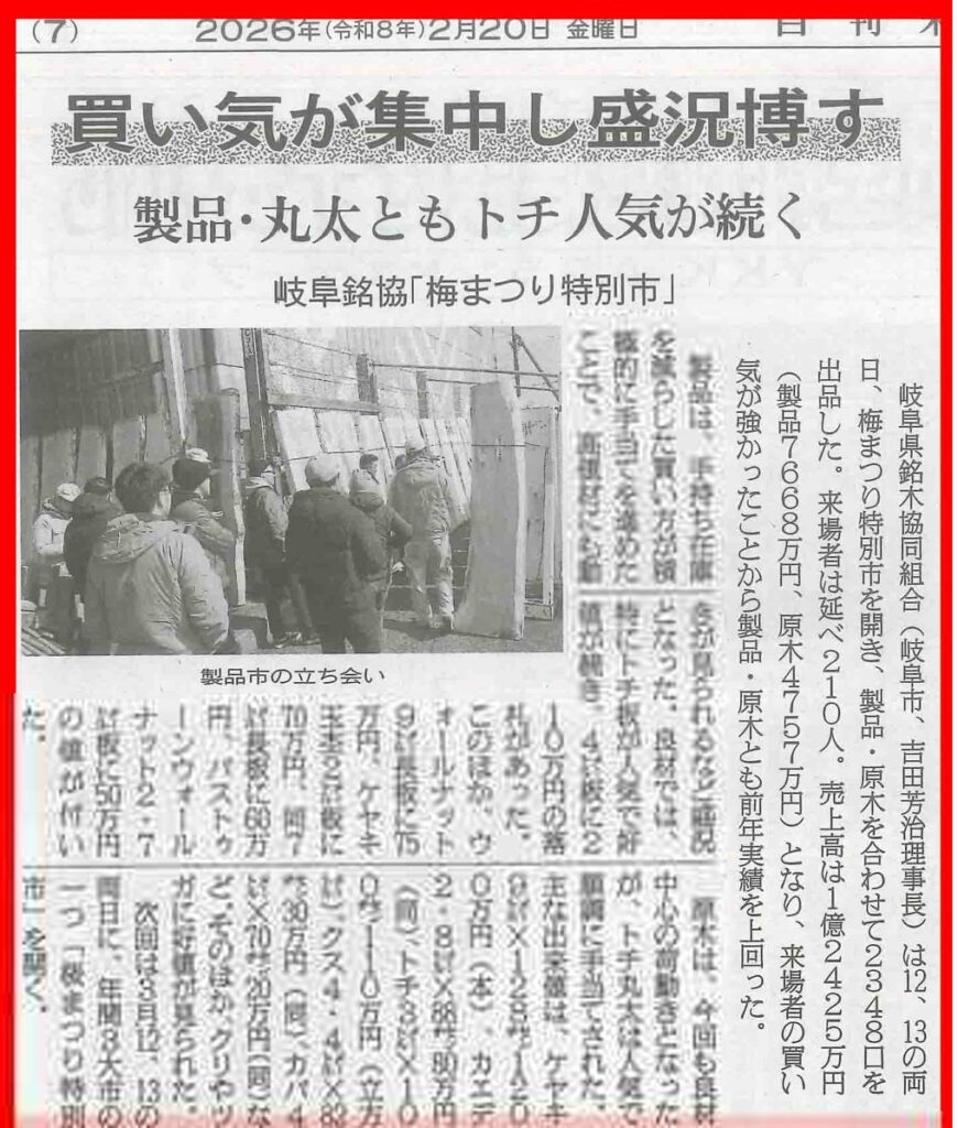 2/20 日刊木材新聞「買い気が集中し盛況博す 岐阜銘協「梅まつり特別市」」