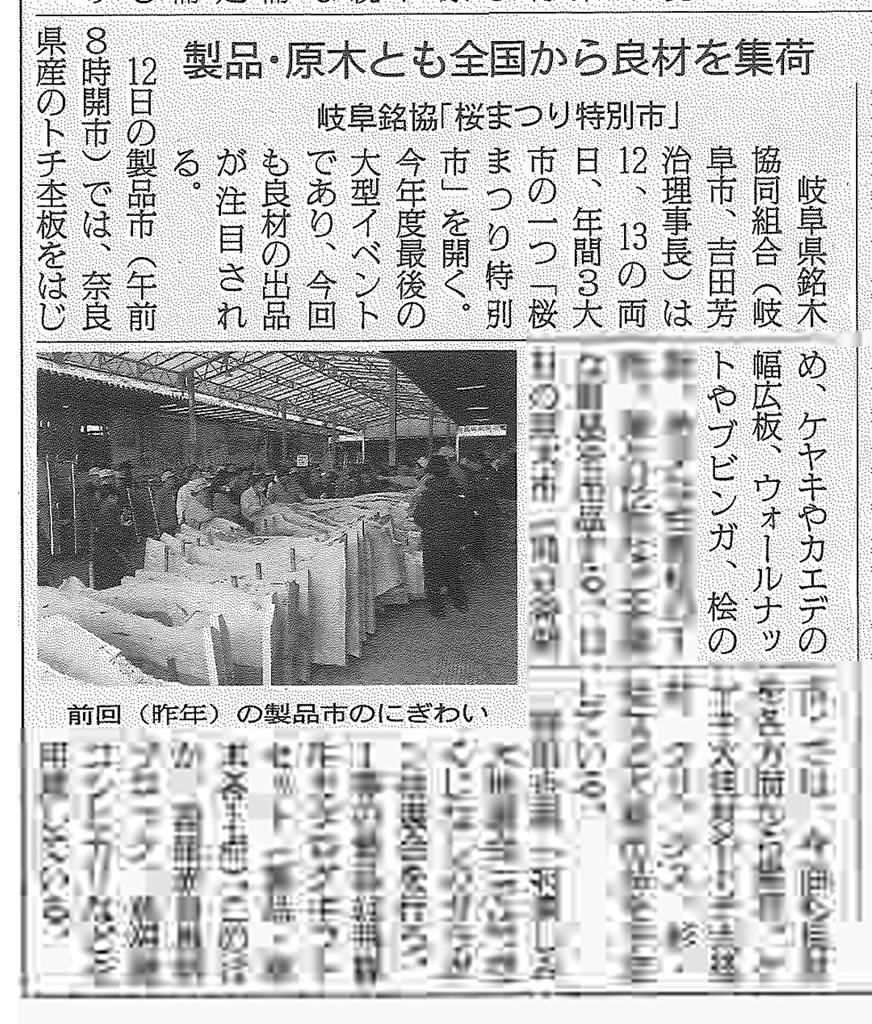 3/11 日刊木材新聞「製品・原木とも全国から良材を集荷 岐阜銘協「桜まつり特別市」」