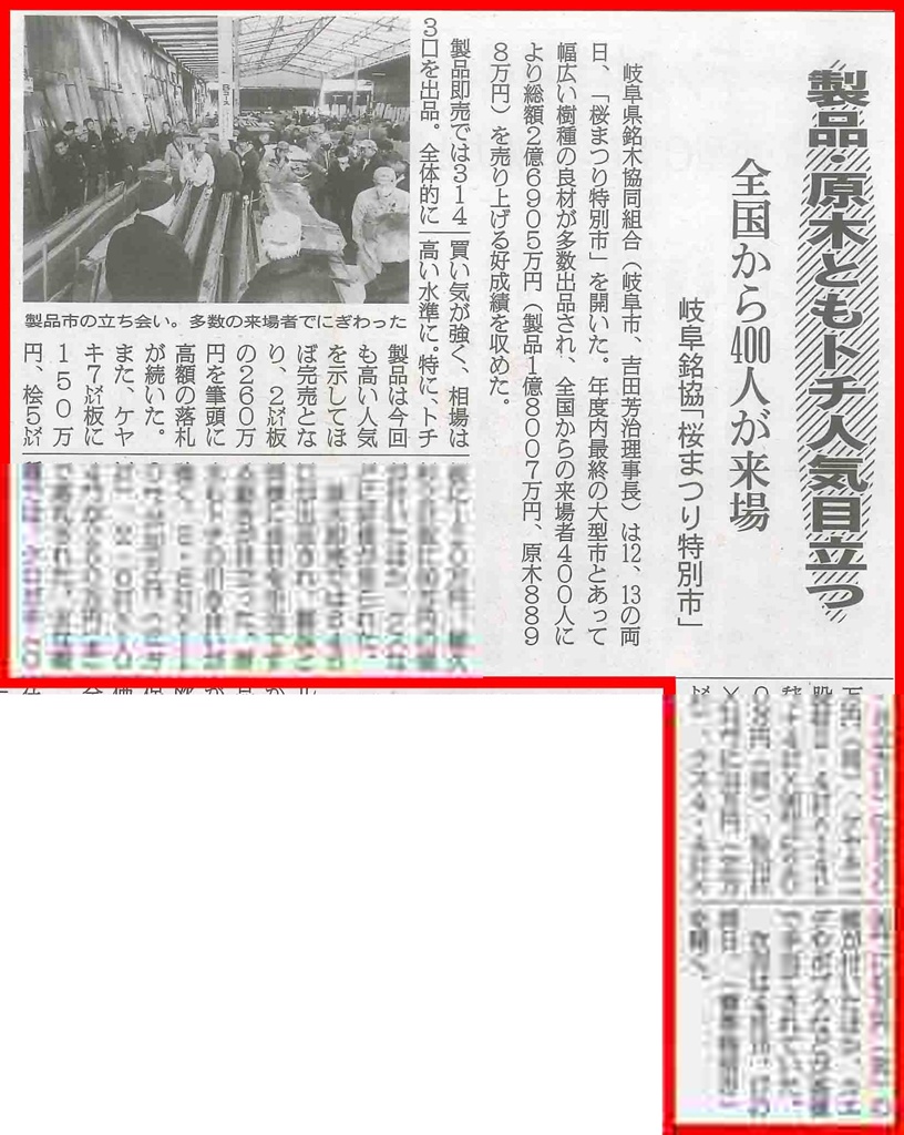 3月19日の日刊木材新聞で、ヤマガタヤ産業社長が理事長を務める岐阜県銘木協同組合にて12日・13日に開催した「桜まつり特別市」についての記事が掲載されました。