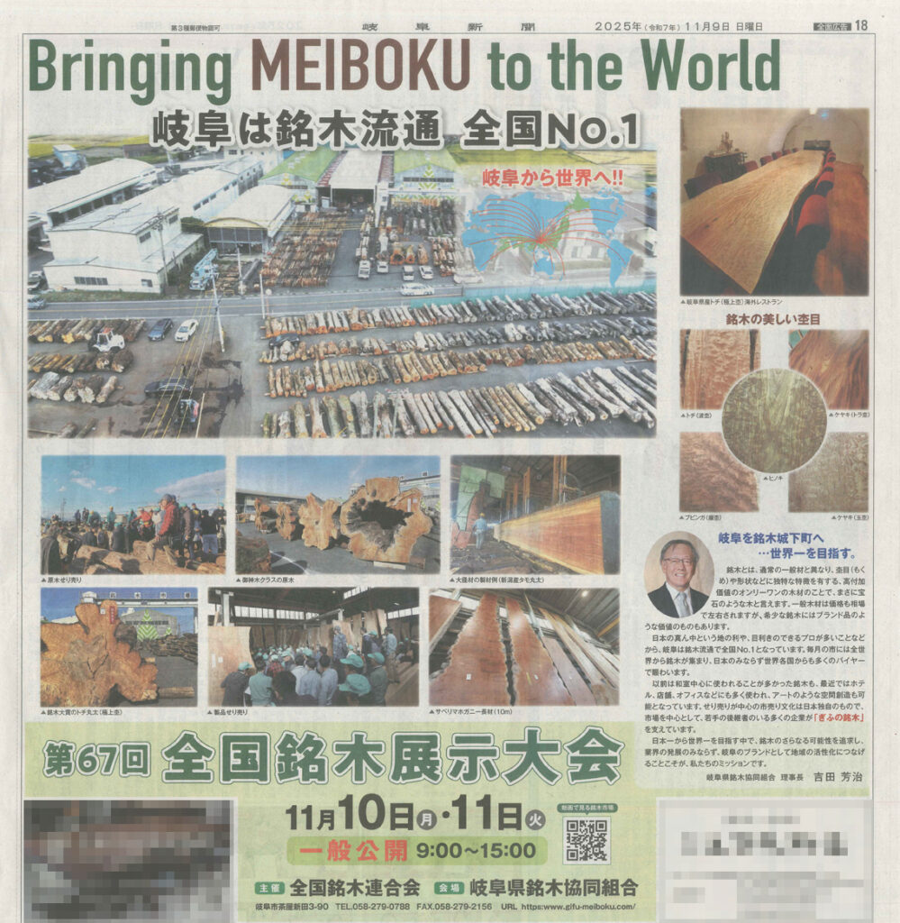 11月9日付の岐阜新聞18面にて、11月10日(月)・11日(火)開催「第67回 全国銘木展示大会」の全面広告が掲載されました。