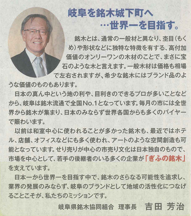 弊社社長が岐阜県銘木協同組合の理事長としてコメントを寄せております。