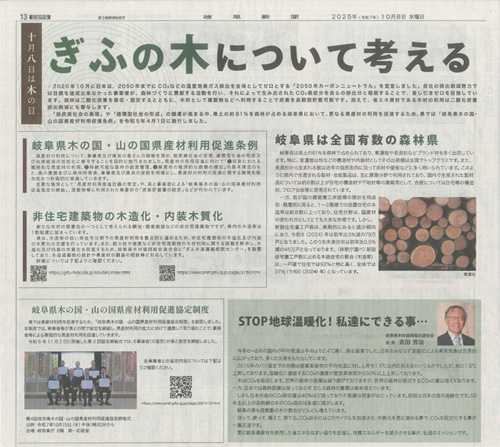 8月10日付の岐阜新聞12・13面にて、10月8日の「木の日」にちなんだ、ぎふの木について考える企画特集記事が掲載されました。