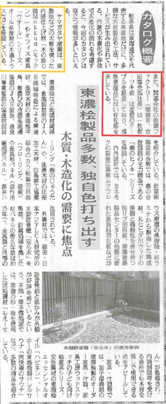 2025年4月16日付の日刊木材新聞での、「ぎふの木製品カタログ Vol.2」についての記事で、ヤマガタヤ産業とグループ企業の板蔵ファクトリー…
